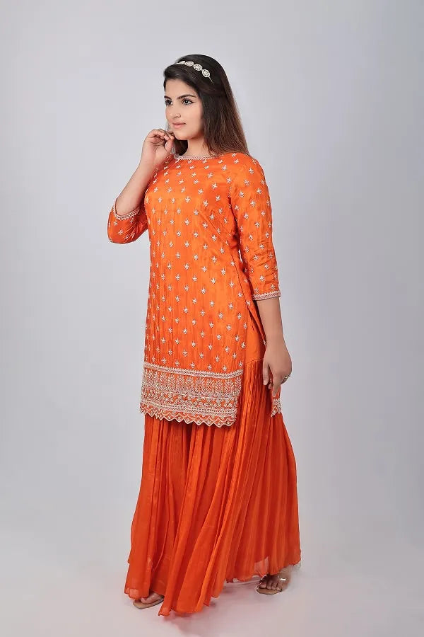 Orange zardosi work short kurti in silk fabric with sharara and dupatta in chinon fabric. Embellished with sequins, beads and zardosi work on full kurti. Designed with round neck work short heavy designer kurti with 3/4th sleeves. Matched with sharara pant in chinon fabric. Topped with light work and lace embroidered dupatta.