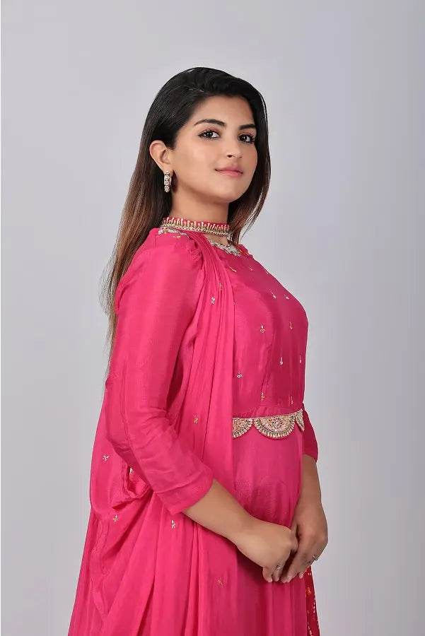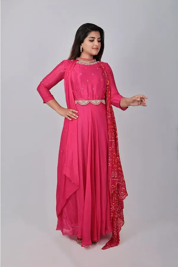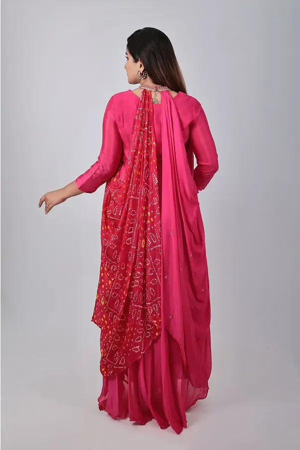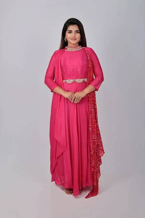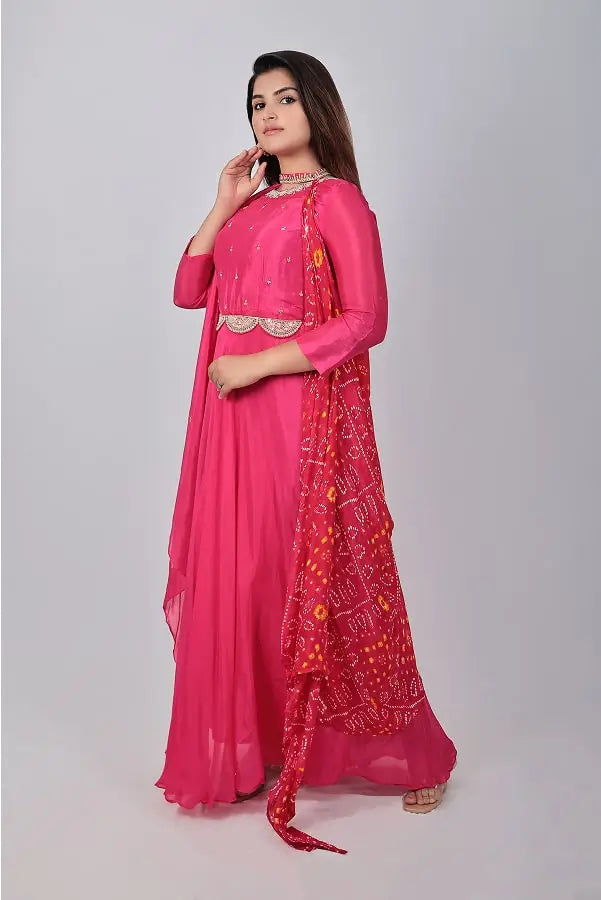Pink bandhani collar neck drape & gown in taffeta silk and georgette fabric. Embellished with beads, sequins, zardosi and thread work. Designed with round neck embroidered work. Matched with neck collar embroidered drape cape with one sided bandhani print and another side plain. Topped with embroidered belt.
