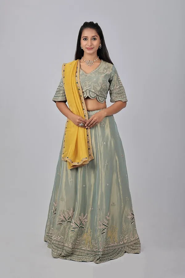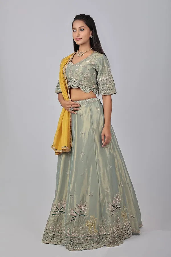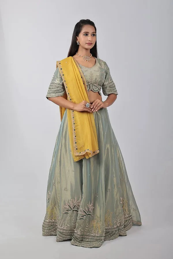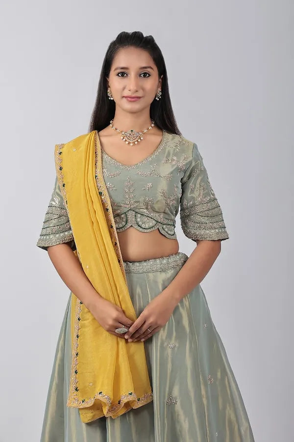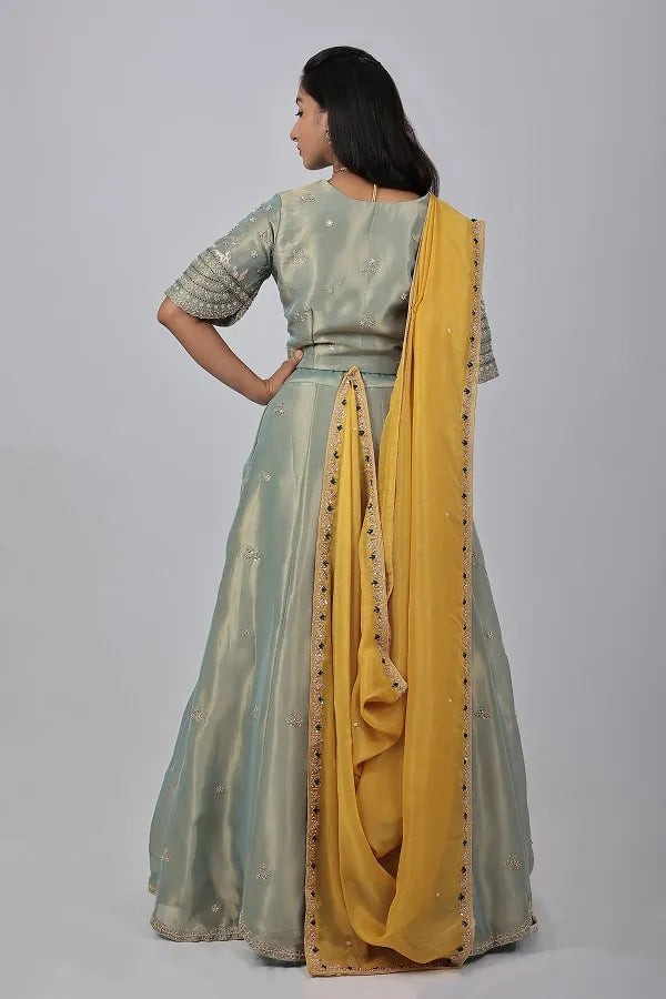Pista green heavy work blouse, lehenga & mustard dupatta in shimmer organza fabric. Embellished with sequin, zari, bead, zardosi, cut dana and thread work. Designed with v neck cutwork detailed hem at waist and sleeves of blouses. Matched with lehenga with embroidered small motifs work all over and heavy waist belt. Topped with embroidered organza dupatta.