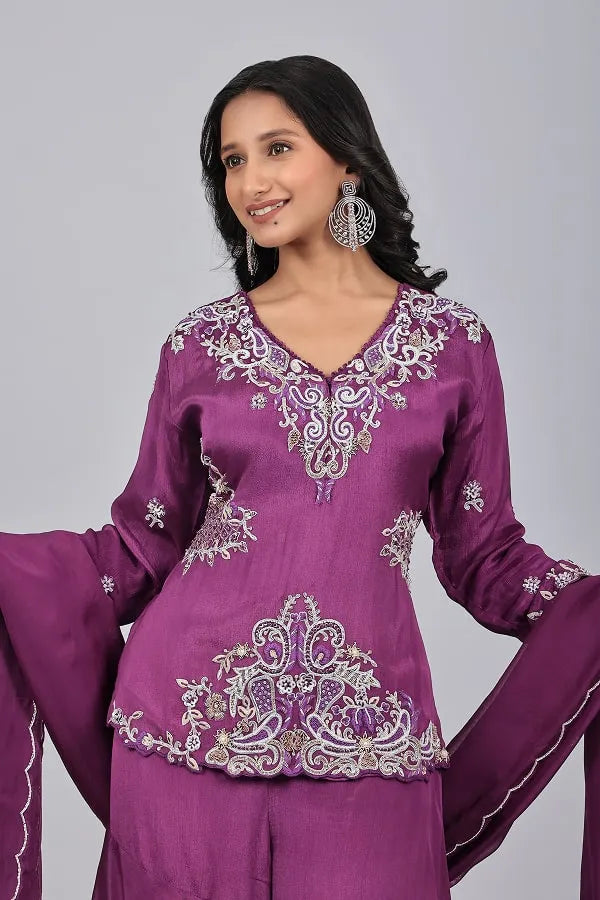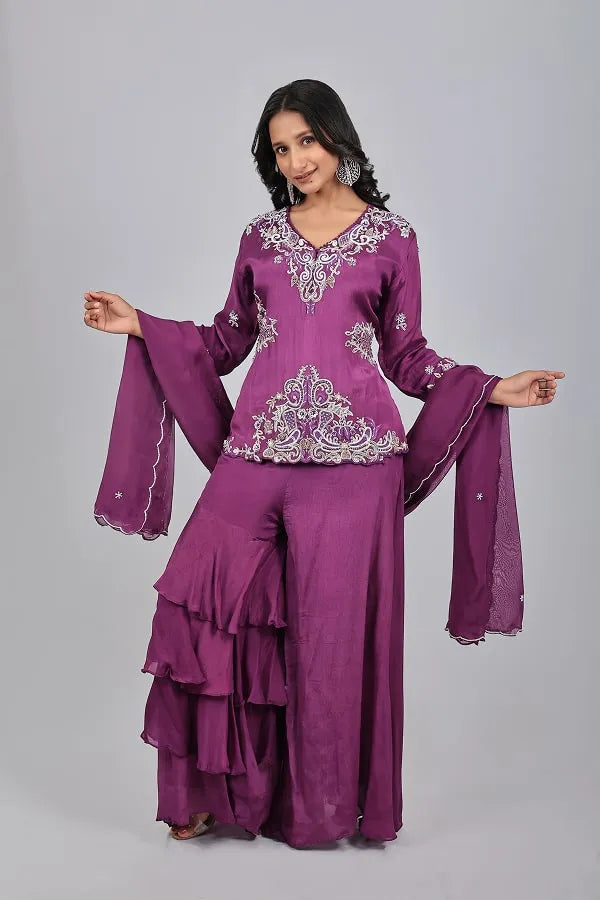 Purple top, palazzo and dupatta co-ord set in chinon chiffon fabric. Embellished with sequins, cutdana, zardosi, thread work and beads with floral motifs work on neckline and hem of short kurti with 3/4th sleeves. Designed with deep v neck with a looped piping border and embroidered work on neckline and hem of kurti. Matched with one sided ruffle pattern palazzo pant. Topped with dupatta in chinon chiffon fabric.
