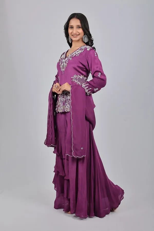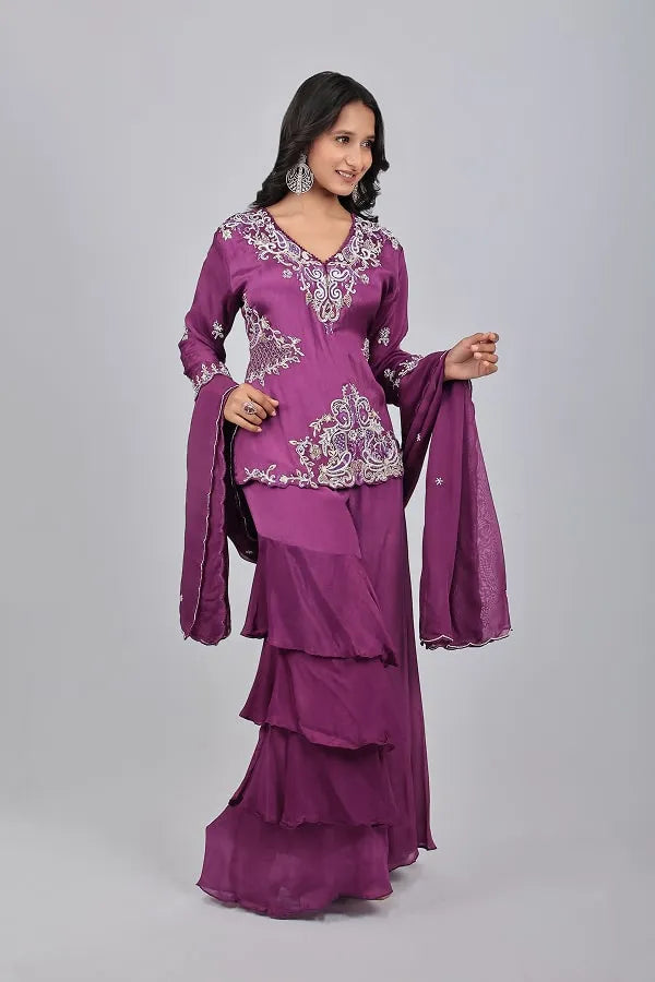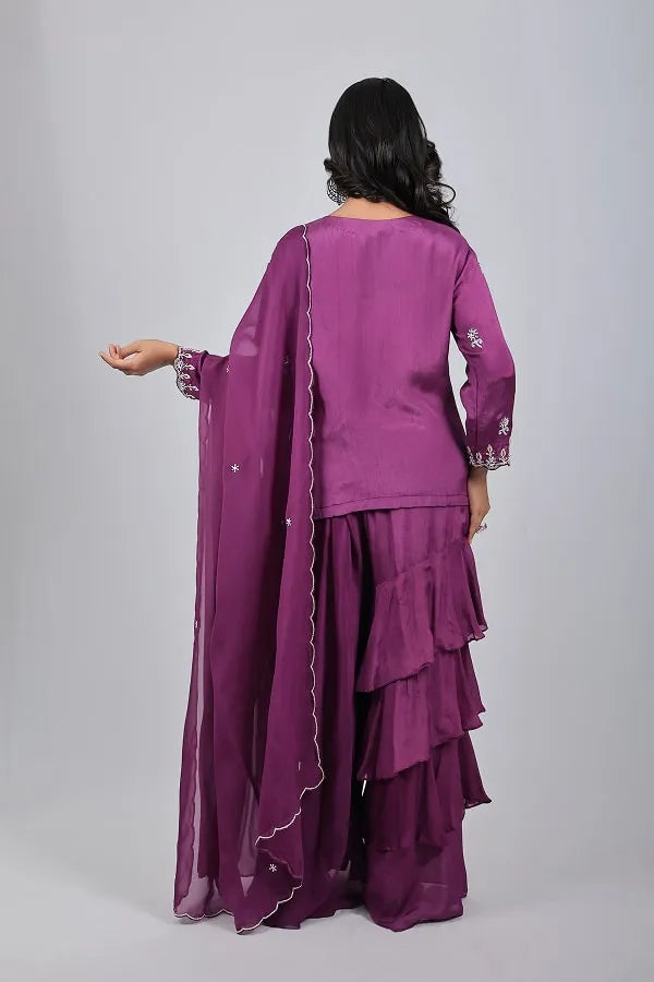 Purple Ruffle Kurta Set with Palazzo & Dupatta