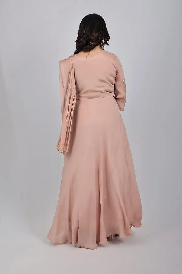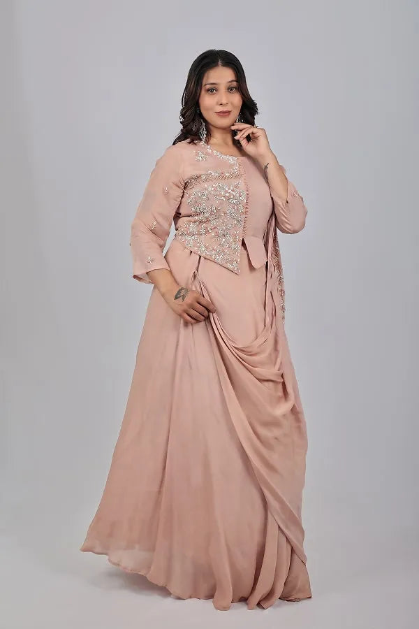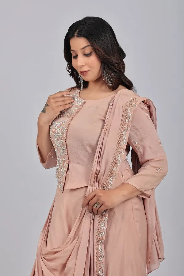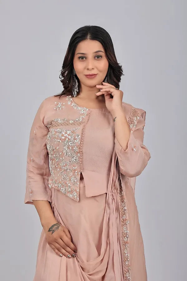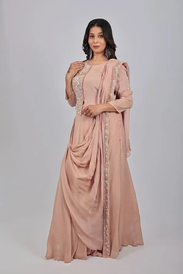 Chickoo work top and skirt with attached drape dupatta in chinon chiffon fabric.  Embellished with beads, sequins, zari thread, cutdana, zardosi on top and dupatta. Designed with round neck, half side work ,loops on centre front and sit on hem, 3/4th sleeve with floral motifs embroidery. Matched with lehenga and drape pleated dupatta with work detail lace.