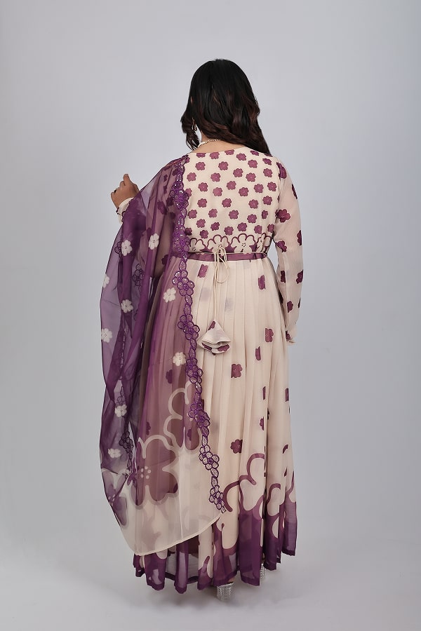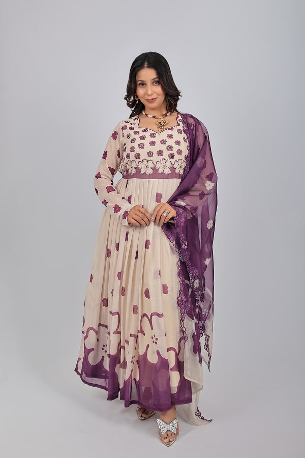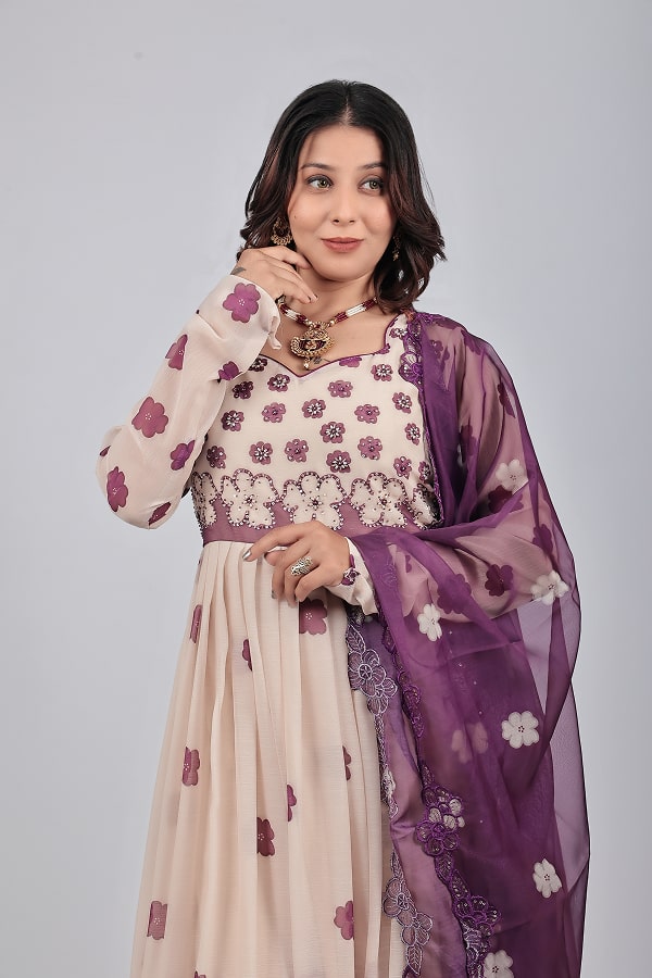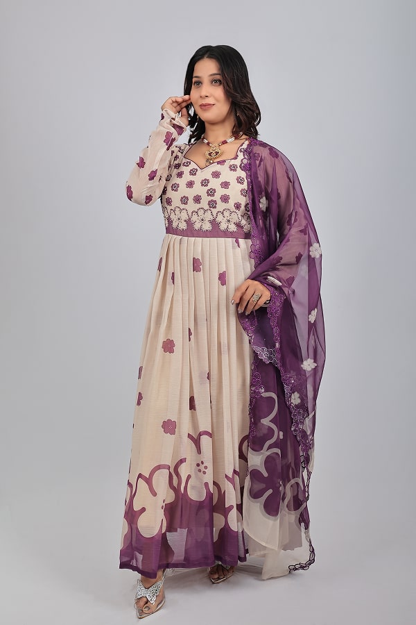 White purple floral print embroidered anarkali, bottom and dupatta in chiffon and organza fabric. Embellished with beads, sequins, pearl beads work on floral printed anarkali. Designed with sweatheart neckline yoke patch work and long sleeve along with placket on it.>> Matched with cotton pants. Topped with cutwork detail in digital print dupatta.