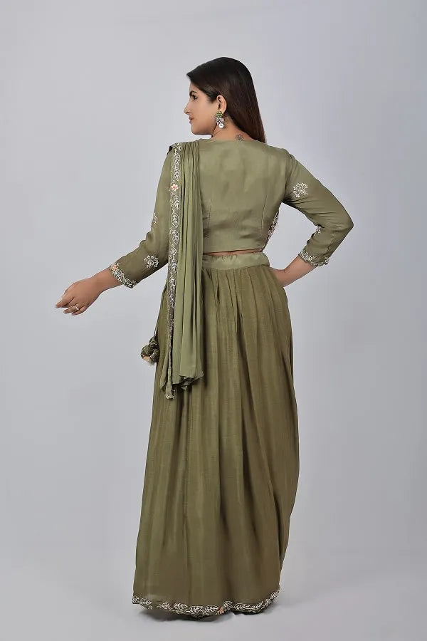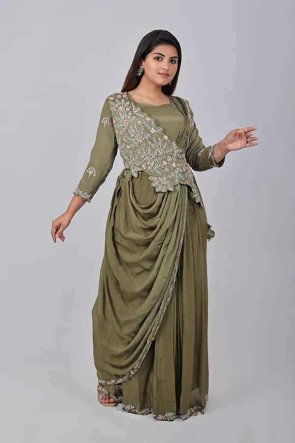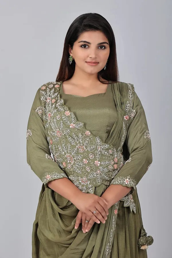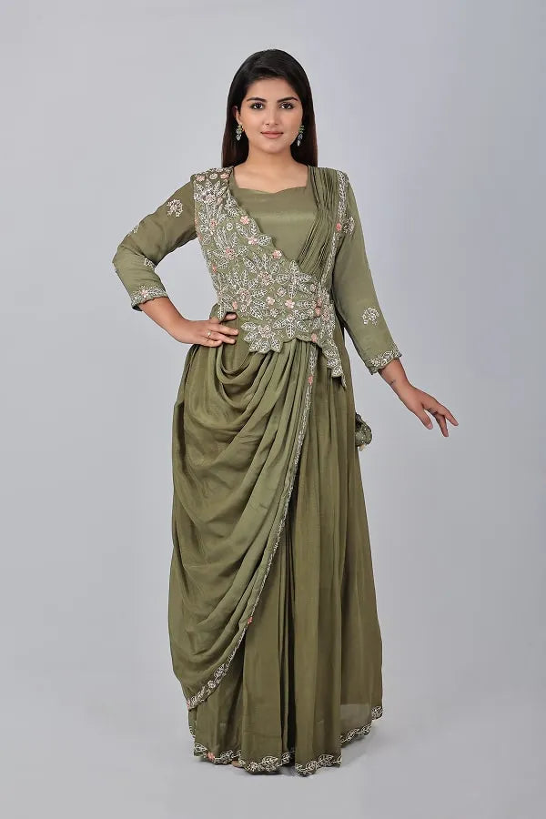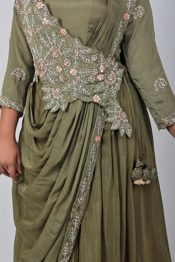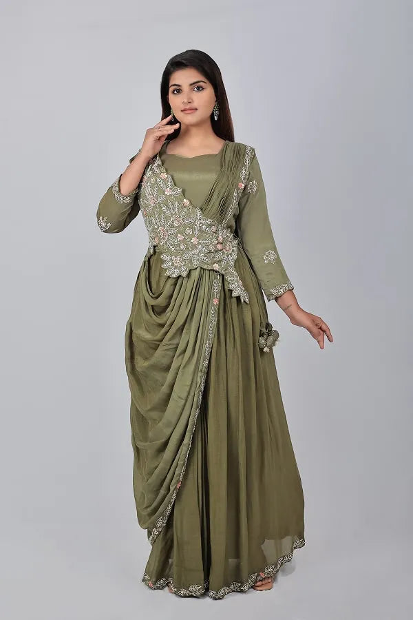 Olive green angrakha style gown attached with draped dupatta chinon fabric. Embellished with beads, sequins, work, zardosi, cutdana and gotta patti work. Designed with sweetheart neck angrakha pattern full embroiderd work blouse with 3/4th sleeves and tessle detailing on it. Matched with drape dupatta in chinon fabric. Topped with embroidered belt.