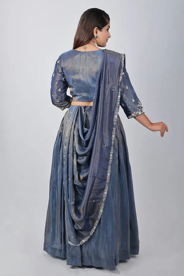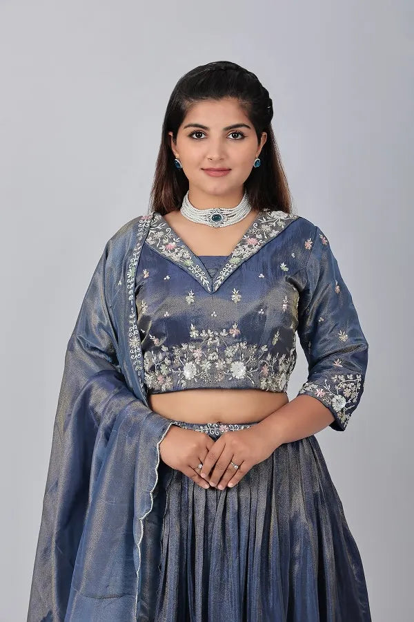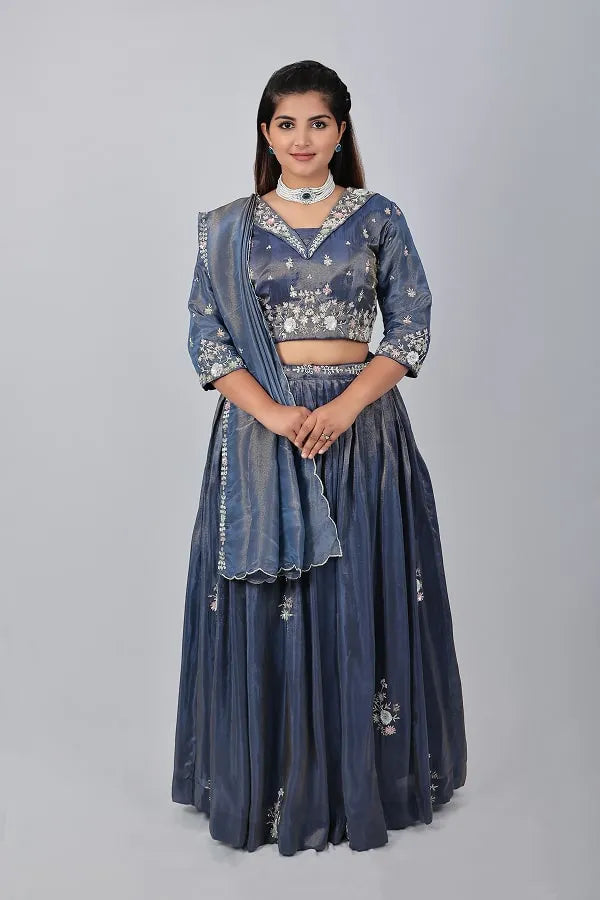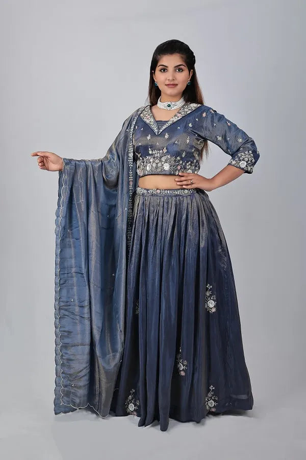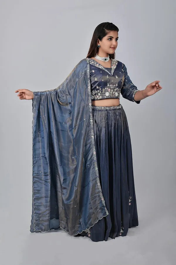 Purple Skirt, Blouse, & Dupatta in Organza Shimmer fabric. Embellished with sequins, zari, zardosi, beads, cutdana and floral motifs. Designed with v neck collar with pleats covering in centre and embroidered motifs all over. Matched with embroidered butta and border in lehenga. Topped with lace border detailing work dupatta.
