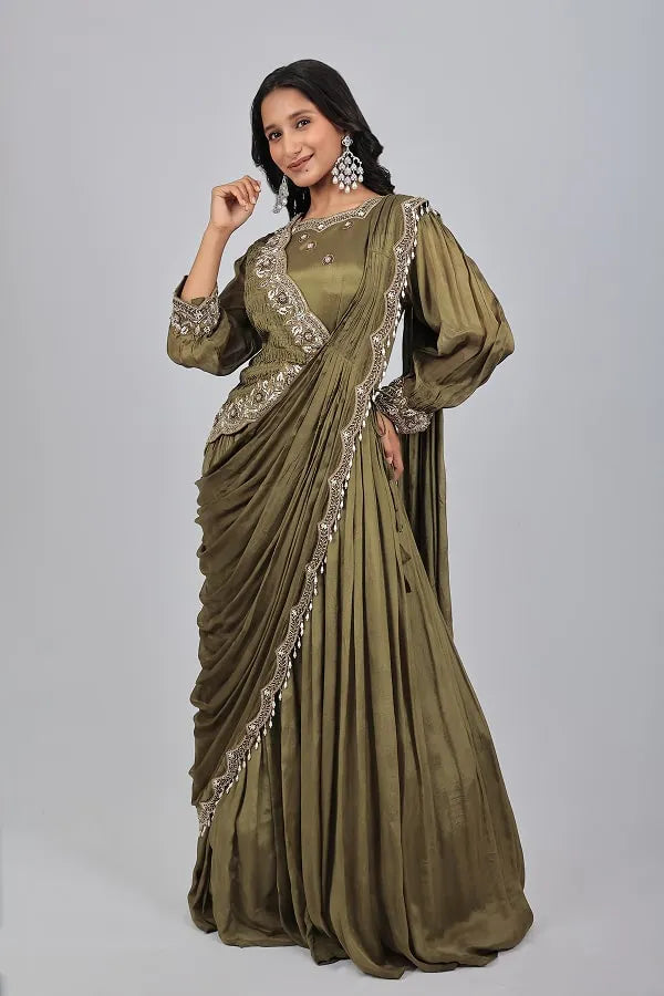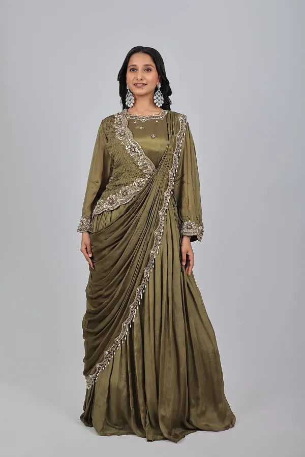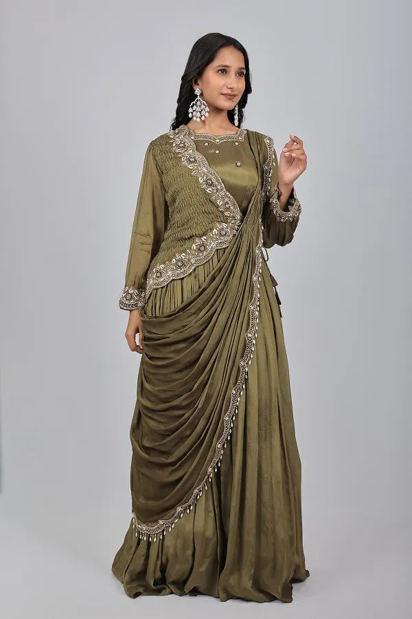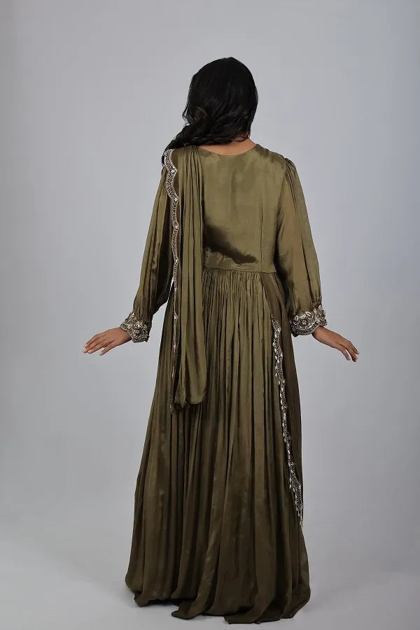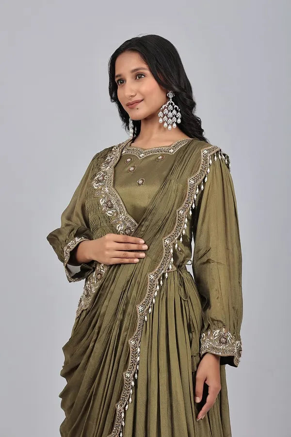 Mehndi green angrakha style gown attached with draped dupatta chiffon fabric. Embellished with beads, zari, work ,thread work, cutdana, sequins, dabka, on neck border, jacket and drape dupatta. Designed with cutwork on neck,angrakha pattern jacket on one side of gown. Attached with drape dupatta.