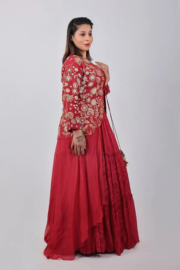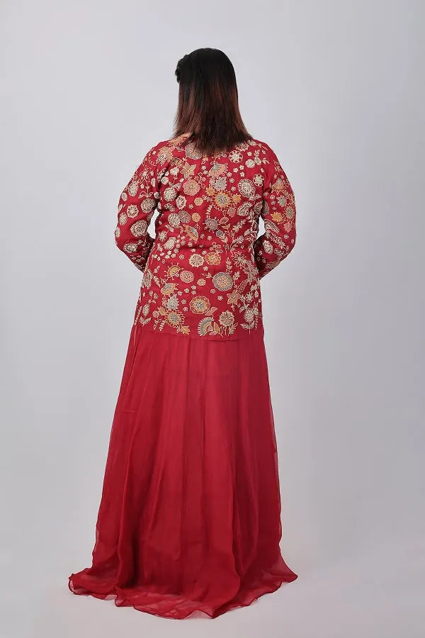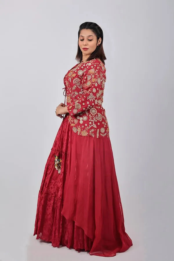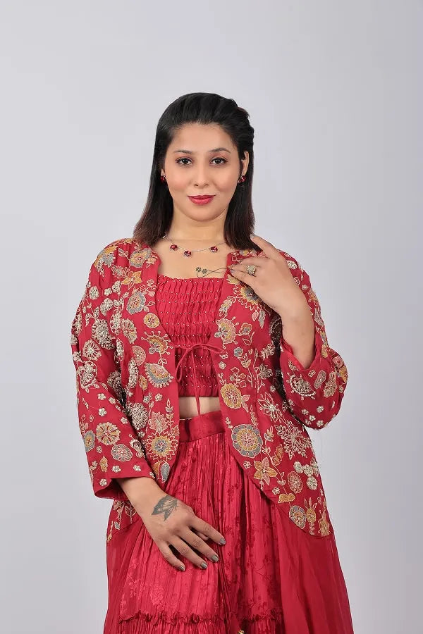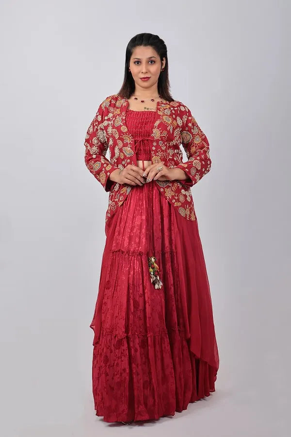 Red inner with embroidered long jacket in organza & lehenga in jaquard georgette fabric. Designed with inner fabric manipulation pattern and bead work on it. Matched with three-tier layer gather lehenga in georgette fabric. Topped with embroidered jacket in organza fabric.