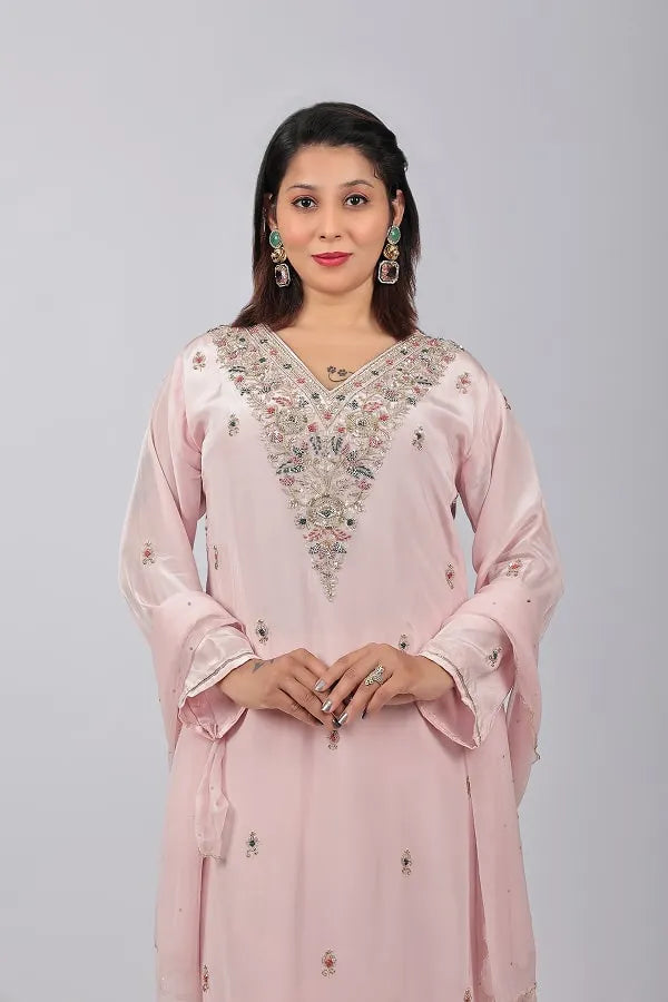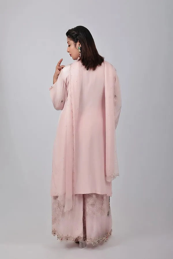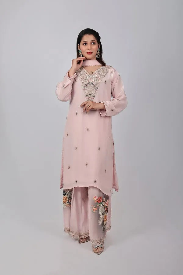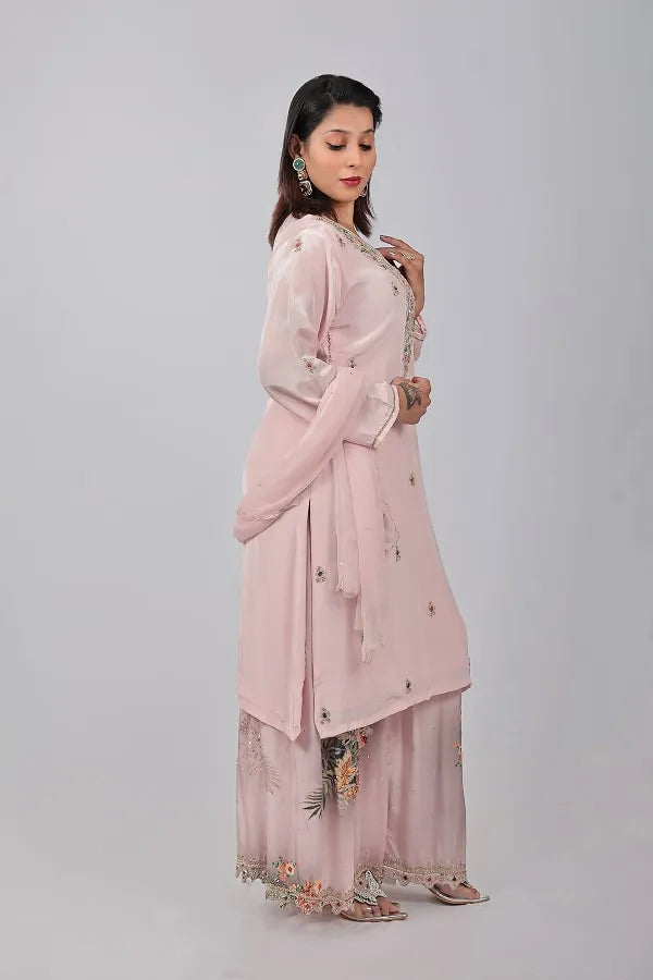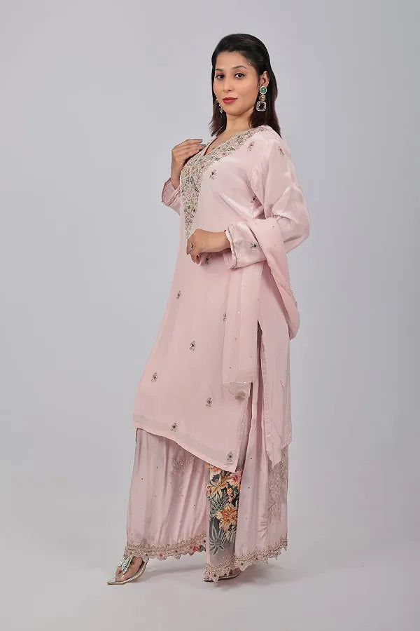 Baby pink kurti, flare palazzo & dupatta in viscous crepe fabric. Embellished with sequin, zardosi, cut dana, zari work on kurti. Designed with v neck yoke work viscous crepe fabric. Matched with printed palazzo with small stone work. Topped with chiffon dupatta with light embroidered work.